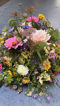 Mijn voorkeur gaat uit naar het creƫren van rouwboeketten, liggend op de kist of op de vloer. Deze manier van werken is namelijk het minst belastend voor onze aarde. Wilt u graag een rouwbloemstuk, dan gebruik ik biologisch afbreekbare oase. De bloemen die op de pluktuin groeien zijn sterk en kunnen tegen een stootje, dit omdat ze alle tijd hebben gehad om te groeien.